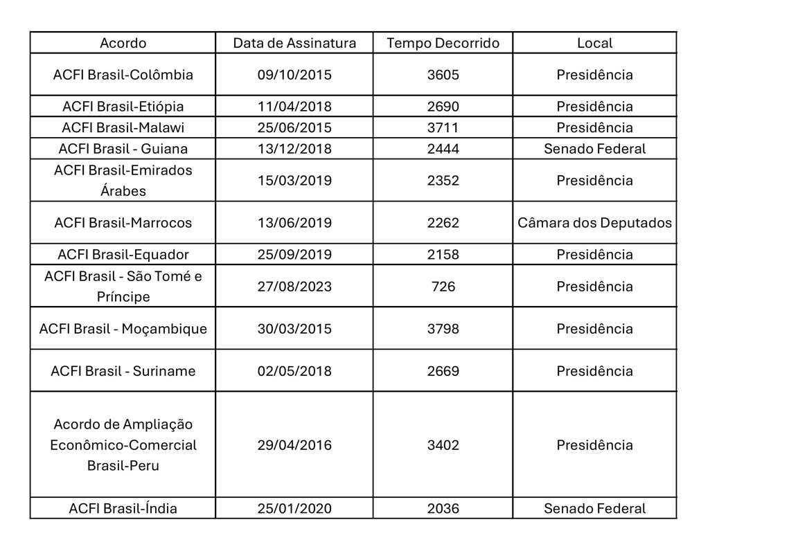 Na tabela abaixo, especificam-se alguns dos tratados analisados e o tempo decorrido desde as assinaturas. Neste caso, apenas os acordos comerciais que ainda não foram internalizados pelo governo brasileiro.